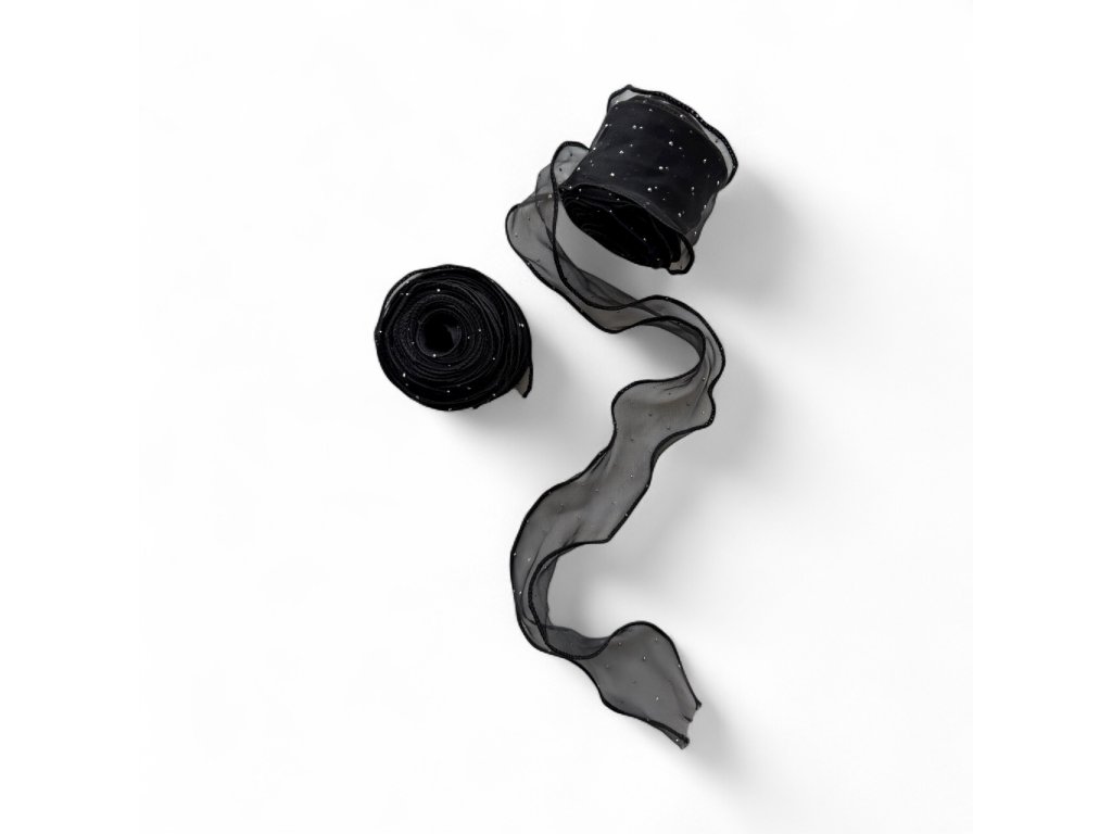 Luxusní černá šifonová stuha s jemnými třpytkami přináší eleganci a šarm do každého projektu