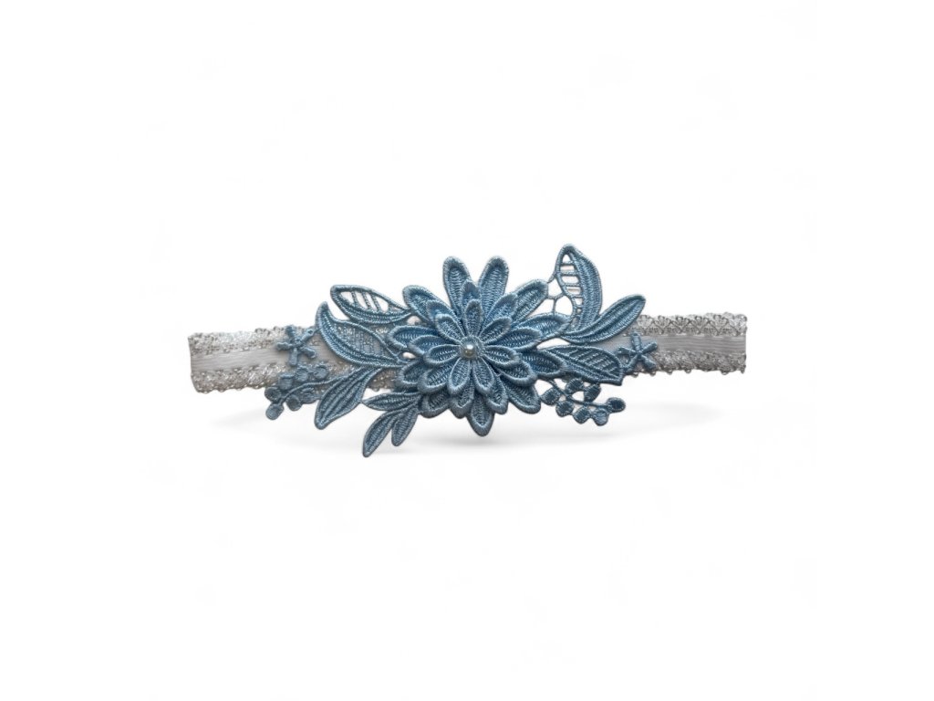 Bílý krajkový svatební podvazek s modrou květinou.
